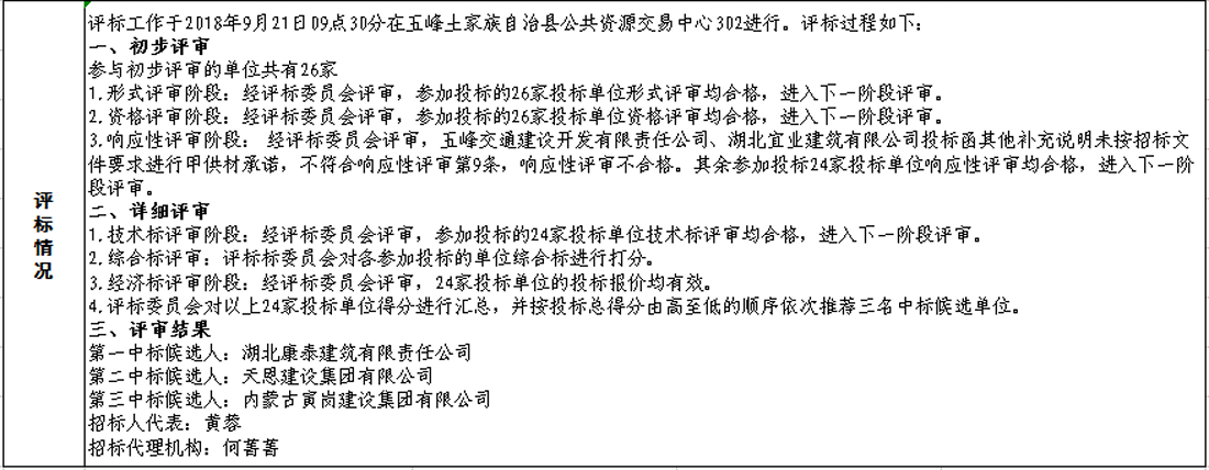 五峰新县城艾家坪路(小河路至黄龙洞)道路工程A标段于2018年8月28日在五峰公共资源交易信息网发布招标公告,2018年9月21日9时30分在五峰公共资源交易中心开标、评标 ,根据评标委员会提交的评标报告,现将中标候选人公示如下: